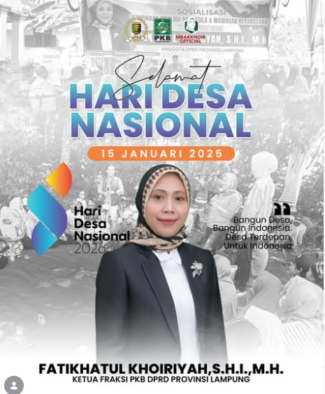 Peringatan Hari Desa Nasional yang jatuh pada 15 Januari 2025 menjadi momentum penting untuk memperkuat pembangunan desa sebagai fondasi kemajuan bangsa. Hal tersebut disampaikan oleh Fatikhatul Khoiriyah, Ketua Fraksi PKB di DPRD Provinsi Lampung, melalui unggahan media sosialnya.