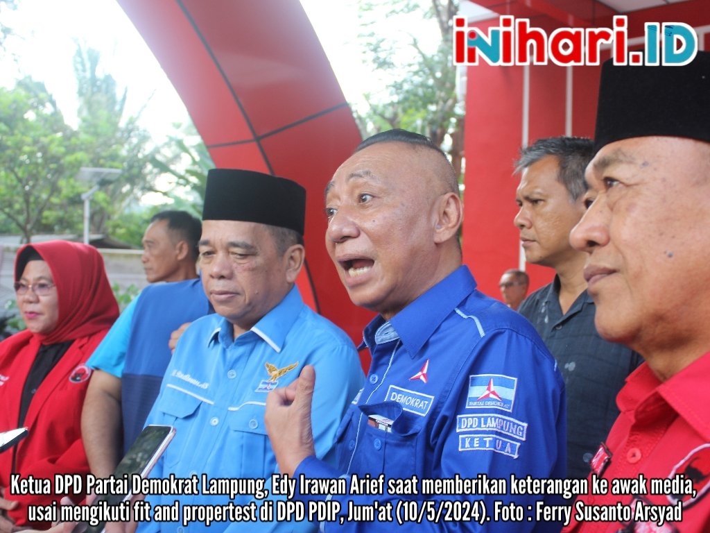 Bandar Lampung, inihari.id – Ketua DPD Partai Demokrat Lampung Edy Irawan Arief membeberkan beberapa pertanyaan tim penjaringan, saat menjalani fit and propertest di Kantor DPD PDI Perjuangan, Jumat (10/5/2024).