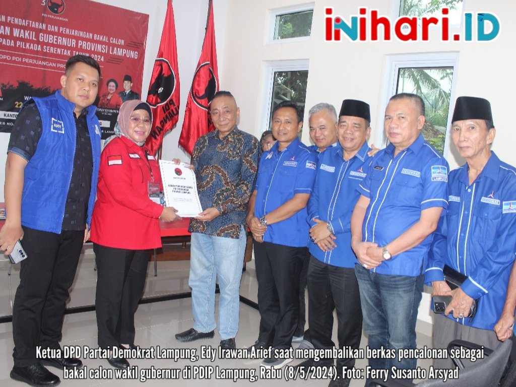 Bandar Lampung, inihari.id – Ketua DPD Partai Demokrat Lampung Edy Irawan Arief mengembalikan berkas pendaftaran sebagai bakal calon wakil Gubernur Lampung ke penjaringan PDI Perjuangan, Rabu (8/5/2024).