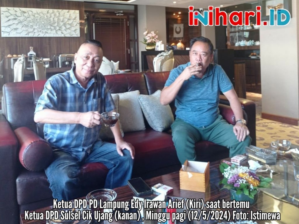 Palembang, inihari.id – Ketua DPD Partai Demokrat Lampung Edy Irawan Arief melakukan pertemuan dengan Ketua DPD Partai Demokrat Sumatera Selatan Cik Ujang, di sebuah tempat di Palembang, Minggu (12/5/2024).