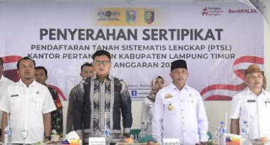 Lampung Timur,  — Ketua DPRD Provinsi Lampung, Ahmad Giri Akbar, menyerahkan sertipikat tanah kepada warga Desa Braja Harjosari, Kecamatan Braja Selebah, Kabupaten Lampung Timur, dalam rangka Program Pendaftaran Tanah Sistematis Lengkap (PTSL) Tahun 2025.(8/10/2025)