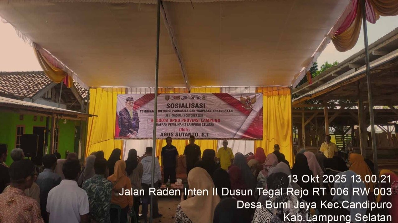 Hal itu disampaikannya saat menggelar kegiatan Sosialisasi Pembinaan Ideologi Pancasila dan Wawasan Kebangsaan (Wasbang) di Desa Bumi Kaya, Kecamatan Candipuro, Kabupaten Lampung Selatan, Minggu (13/10/2025).