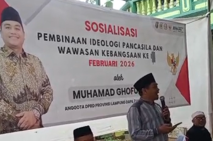 Anggota Komisi IV DPRD Provinsi Lampung, Muhamad Ghofur, menggelar Sosialisasi Pembinaan Ideologi Pancasila dan Wawasan Kebangsaan di Majelis Taklim Pondok Pesantren Al-Ihya, Kecamatan Kalirejo, Kabupaten Lampung Tengah, Minggu (15/2/2026).